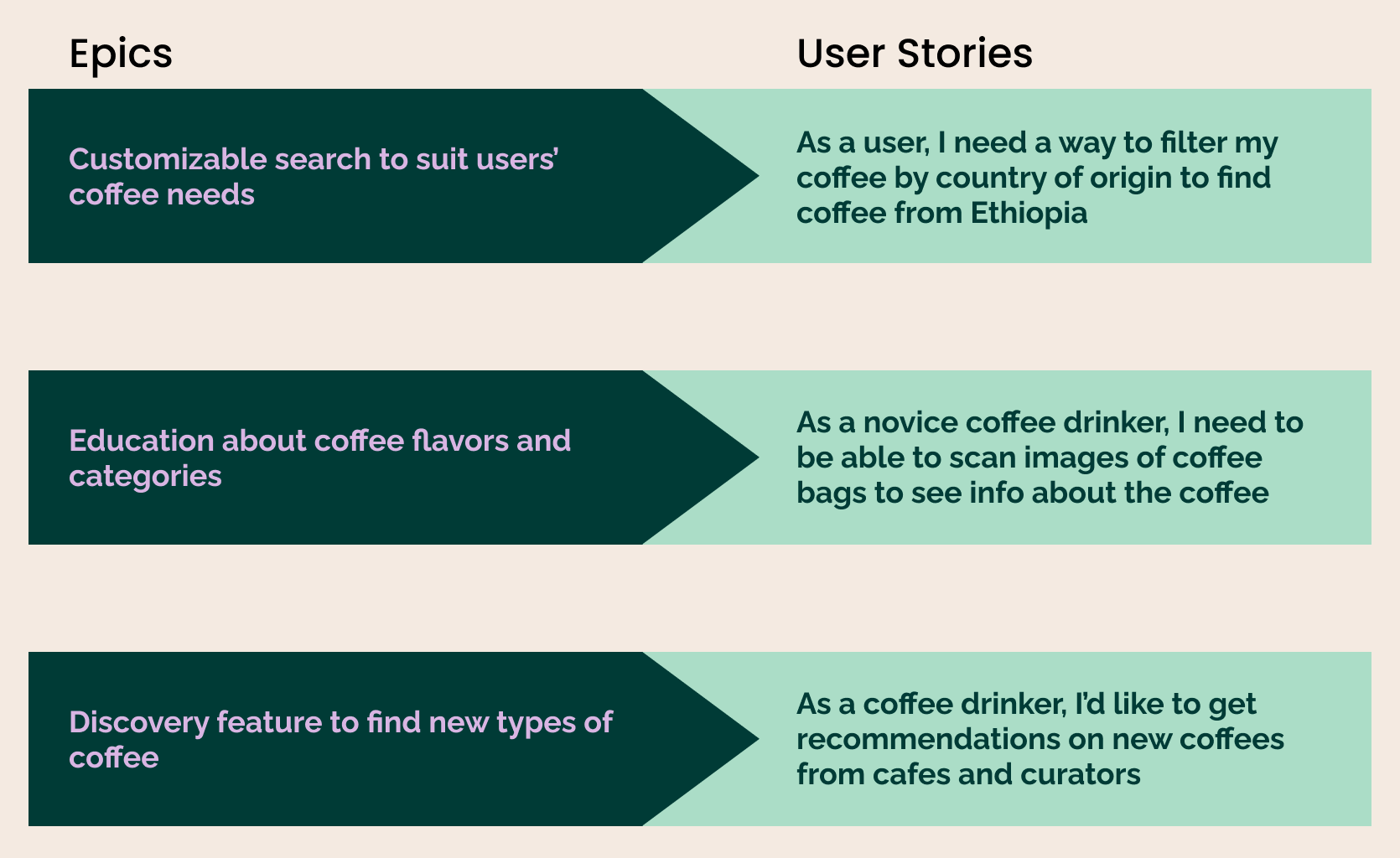 We took these features and generated user epics and stories to help us maintain our focus throughout designing. We used epics to identify major themes, and user stories to hone in on the actual tasks our users want to perform