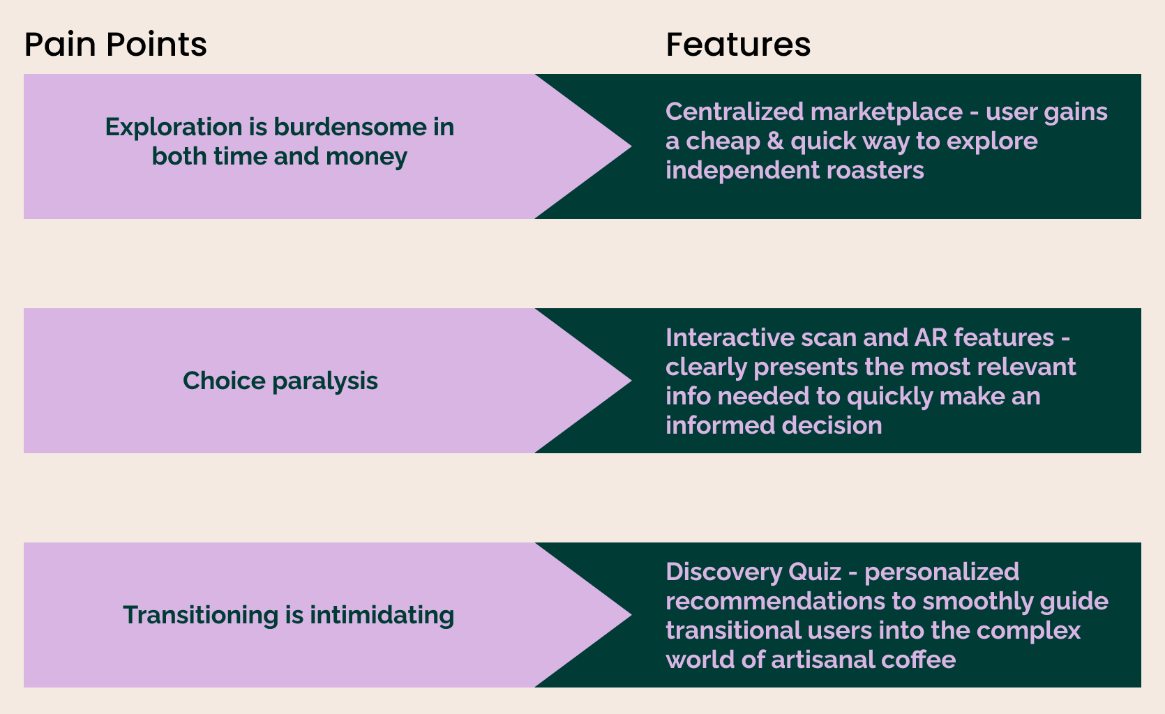 The team dove into exploratory research to learn as much about coffee as we could. We were introduced to the idea that all coffees fall into three different categories that represent three different waves or movements of coffee. The first wave is seen as lower quality and is known as commodity coffee. It began when coffee became a staple in kitchens all around. Folgers and Maxwell are commonly referred to when talking about first wave coffees. The second wave came with big names, such as, Starbucks and Peet’s introducing the idea of choosing coffee based on origin and roasting styles and emphasizing the cafe experience. Finally, third-wave coffee focuses on specialty coffee. Third-wave coffee drinkers enjoy the coffee beans themselves, not just the cafe experience. After comparing notes with our user interviews, we had a good idea that third-wave coffee drinkers or users looking to transition into a third-wave coffee drinker, were most likely our target users.